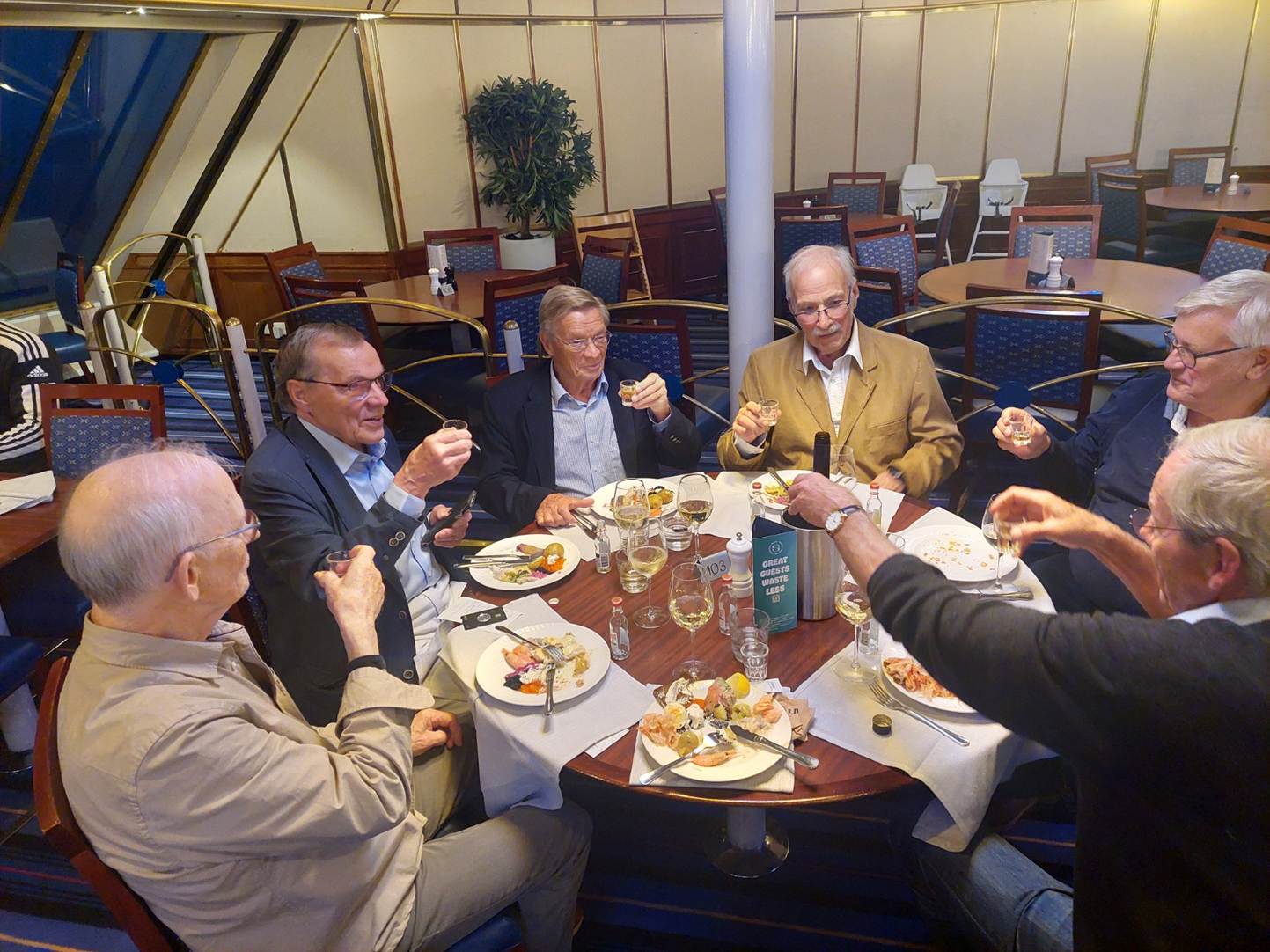 Museon jälkeen ajoimme Viking-terminaaliin. Säätiedot olivat myrskyä ennakoivat. Lääkkeeksi myrskyä vastaan illallisella puheenjohtaja tarjosi kiittäessään retkeläisiä yhdistyksemme puolesta O.P.Andersson akvaviitit. Kun tulimme saariston suojasta Ahvenanmerelle, myrsky tuntui laivan keinumisena ja aaltojen hakkaamisena laivan kylkiin. Aamulla aamiaisella kukaan ei ilmoittanut merisairaudestaan.