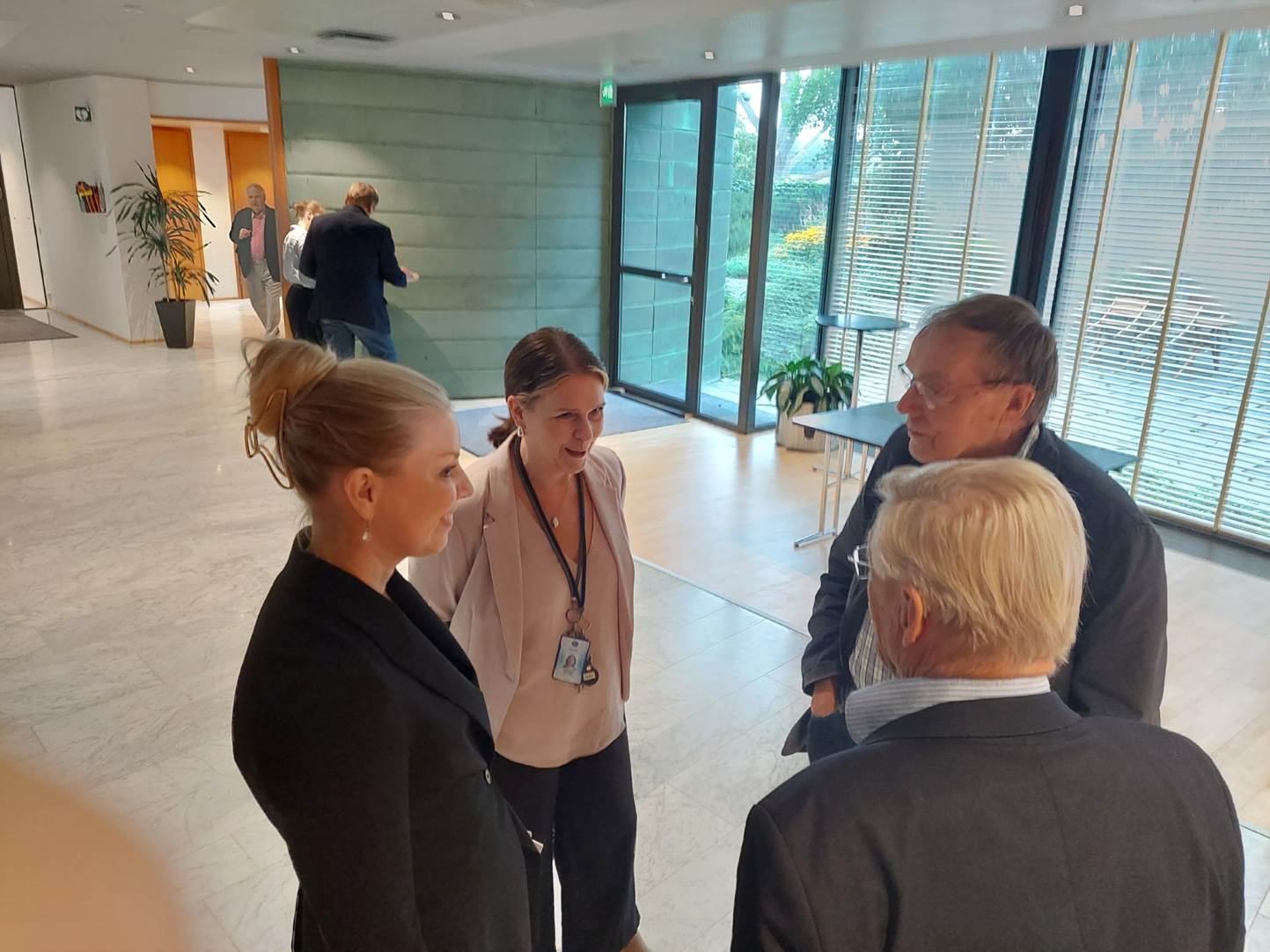 Lounaan jälkeen ajoimme bussilla Suomen suurlähetystöön, jossa isäntinämme toimivat ministeri Christina Lehtinen ja lähetystöneuvos Anna Yletyinen alkuperäisen isäntämme puolustusasiamies, kommodori Juha Kilven jouduttua työmatkalle. Tervetuliaiskahvin jälkeen ministeri Lehtinen kertoi yleisesti Suomen ja Ruotsin yhä kiinteämmästä yhteistyöstä molempien liityttyä NATO:on. Hän myös valotti taloudellista yhteistyötä maidemme välillä.