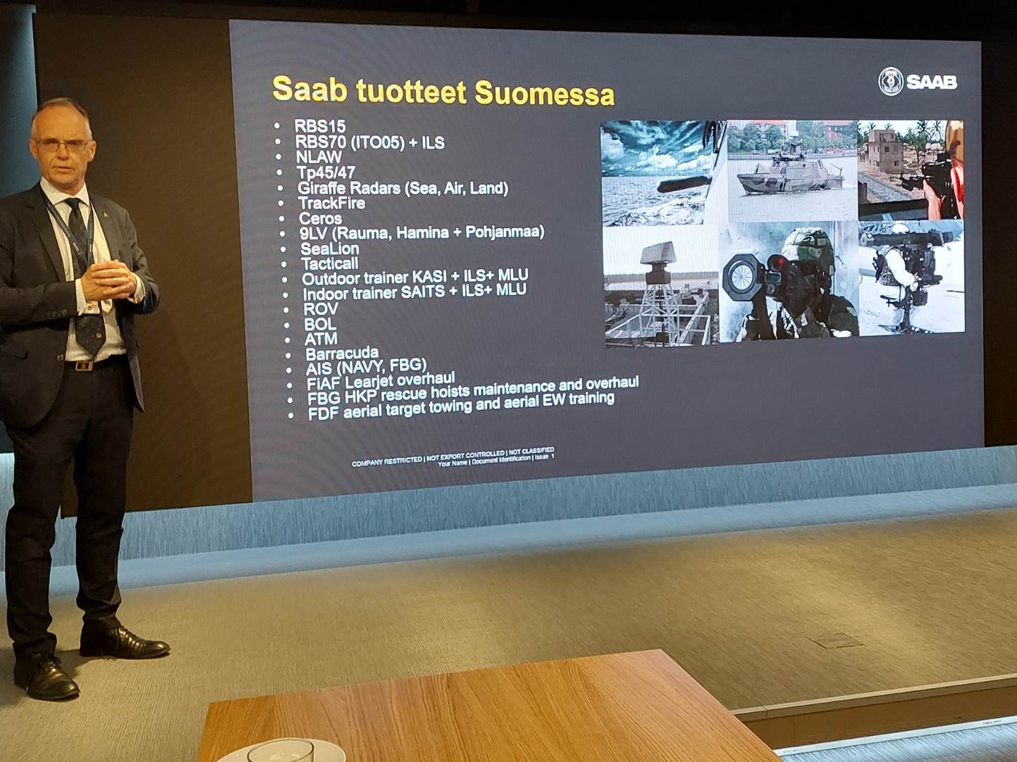 Henriksson esitteli SAABin kehitystä autonvalmistajasta nykyiseen puolustusvälinevalmistajaan. Viimeksi mainittu toiminta oli myös painopiste hänen esityksessään. Yhtiön tausta tässä roolissa oli aluksi toimittaa Ruotsin puolustusvoimille niiden tarvitsemaa kalustoa. Aikaa myöten asiakaskunta on voimakkaasti kansainvälistynyt. He kilpailevat nykyään enemmän korkean teknologian tuotteilla kuin massalla. Suomi on ollut tärkeä asiakas. Lähitulevaisuudessa neljä korvettiamme varustetaan pääosin SAABin toimittamalla aseistuksella ja johtamisjärjestelmillä. Tätä varten SAABilla on Laivue 2020 projektitoimisto Turussa. Myös maavoimillemme on toimitettu moderneja taistelujärjestelmiä, joita meille esiteltiin. SAABin tuotannosta on siviilituotteita vain noin 15 prosenttia.